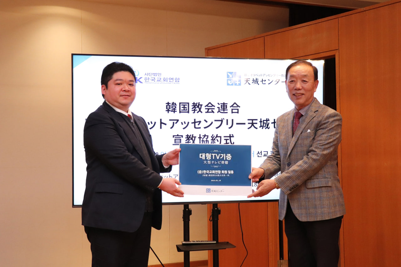 宣教協約式にはCCIKの代表団5名と当教団および天城センター関係者が参加し、天城センターの谷川健太郎代表とCCIKのソン・テソプ代表会長が協約書を交わしました。宣教協約の記念として、CCIKから天城センターに大型モニターが寄贈されました。